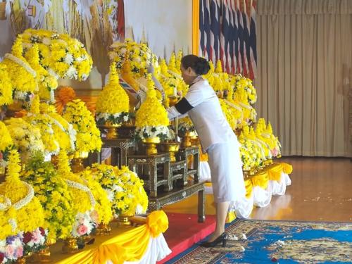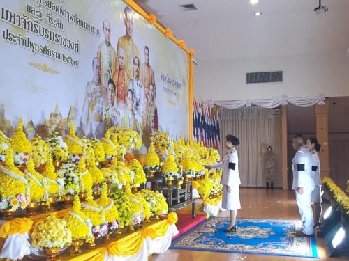 ผู้ว่าราชการจังหวัด สกลนคร ถวายพุ่มดอกไม้ จุดธูปเทียนเครื่องทองน้อย และกล่าวคำถวายราชสดุดี ถวายความเคารพ เบื้องหน้าพระบรมสาทิสลักษณ์ พระบาทสมเด็จพระพุทธยอดฟ้าจุฬาโลกมหาราช