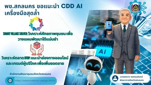 พช.สกลนคร ขอแนะนำ CDD AI เครื่องมือสุดล้ำจากกรมการพัฒนาชุมชน มีปัญหาชุมชน หรืออยากดันยอดขาย OTOP? ให้ CDD AI เป็นผู้ช่วยคุณ! ที่พร้อมเป็น "ผู้ช่วยส่วนตัว" ให้กับทุกฟีเจอร์เด็ดที่ไม่ควรพลาด: Smart Village Solver: วิเคราะห์ศักยภาพชุมชน เพื่อวางแผนพัฒนาได้แม่นยำวิเคราะห์ตลาด OTOP: แนะนำช่องทางออนไลน์และเทรนด์ผู้บริโภค เพื่อเพิ่มยอดขาย